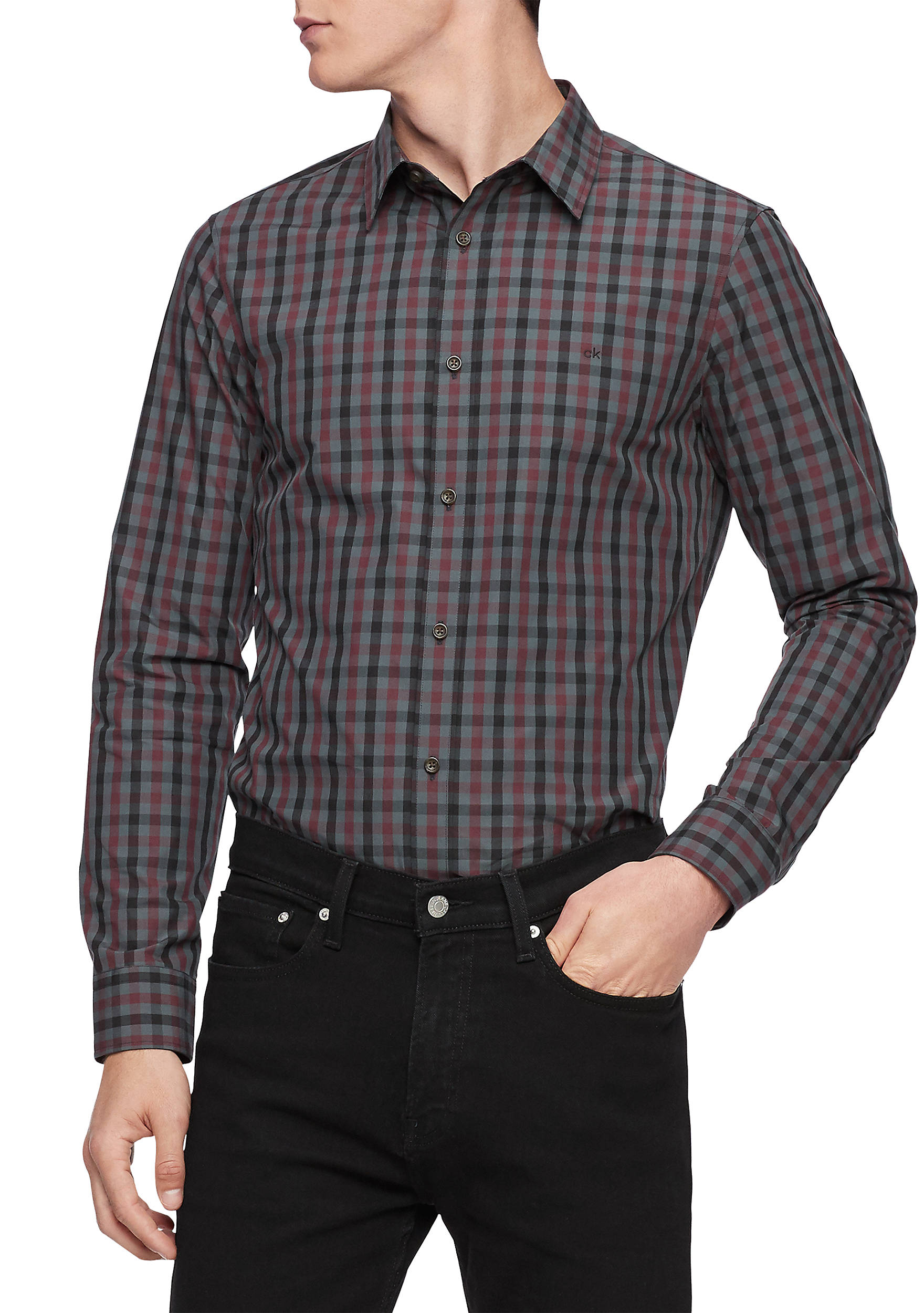 Áo sơ mi nam calvin klein tay dài caro nâu đỏ with logo