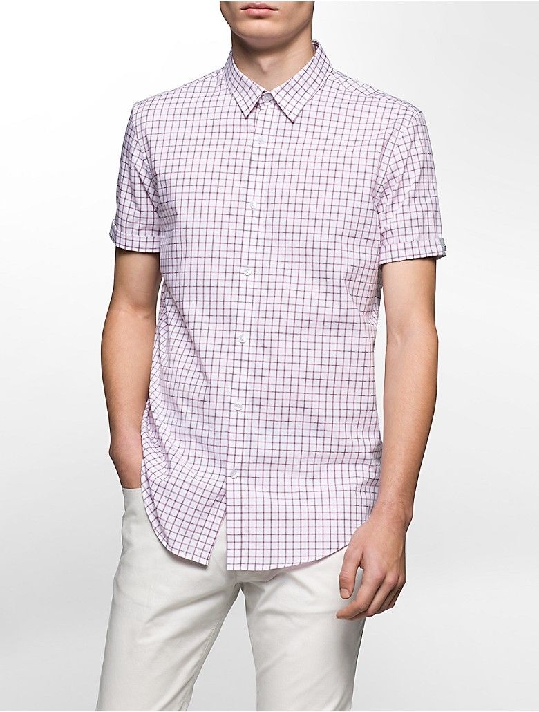 Áo sơ mi nam calvin klein tay ngắn trắng caro đỏ tay nhấn nút