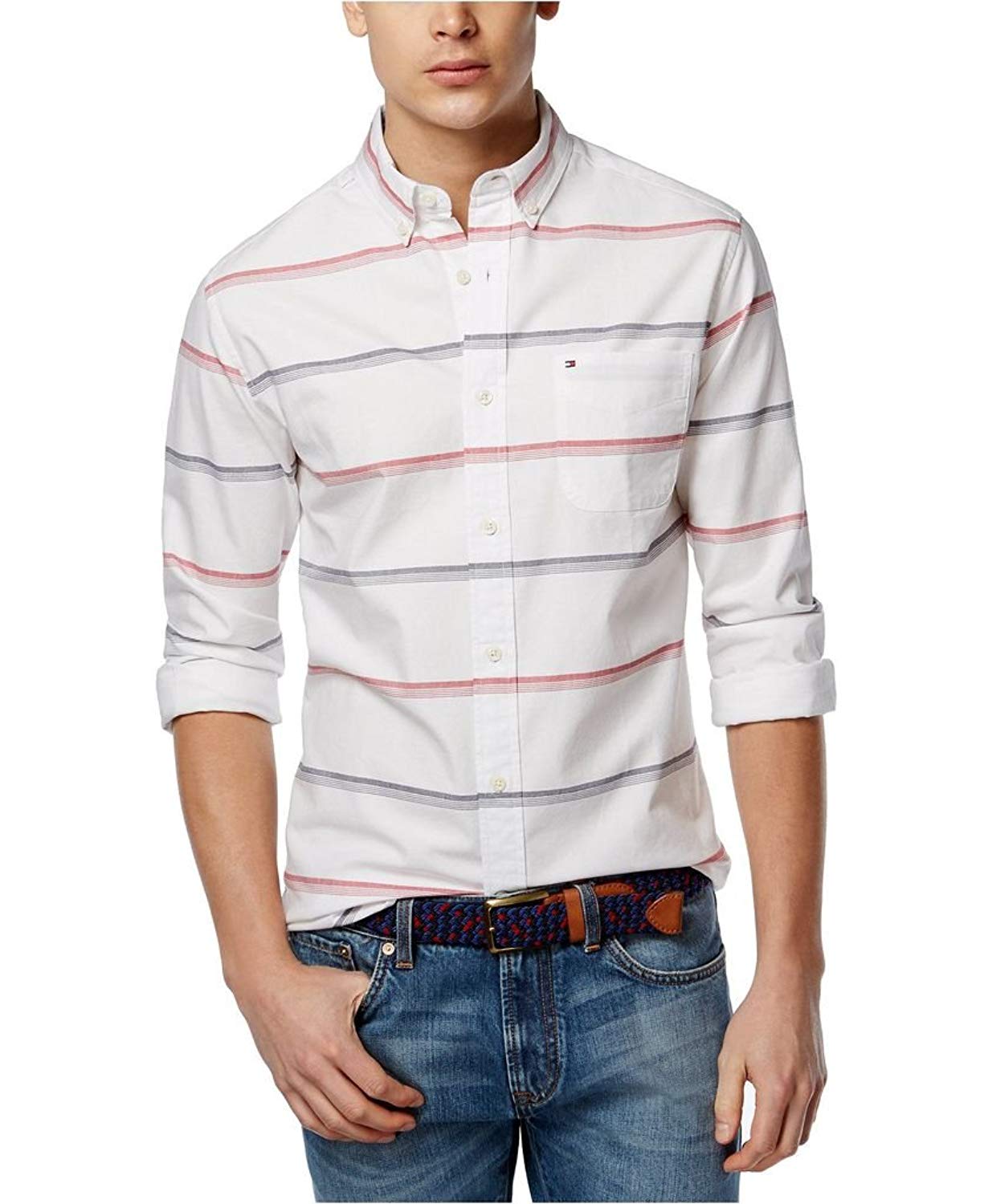 Áo sơ mi nam Tommy Hilfiger tay dài trắng sọc ngang đỏ xám with túi Hàng xách tay USA - 100% Cotton - from Custonfit Made in: Bangladesh